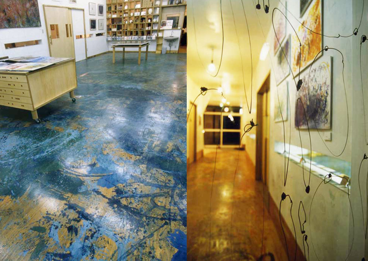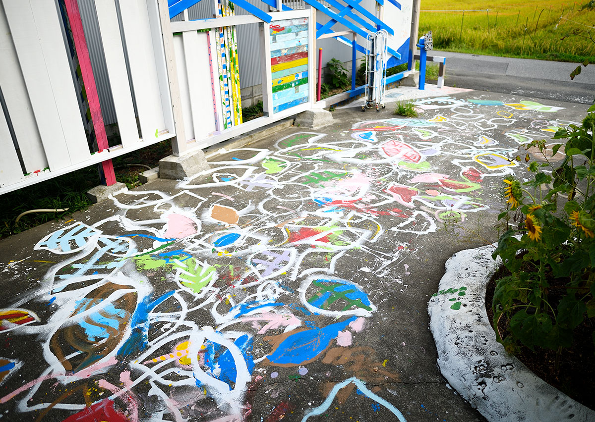 設立時には、庭園美術家の長崎剛志さん、建築家の和田基示さんをはじめとして、中津川浩章さん(アートディレクター)、水川史生さん(デザイナー)、石塚雅子さん(画家)、そして美術・建築系の学生、地域の方々とこれまでにない福祉施設を目指して内部関係者と共に空間を作り上げました。壁面や床の塗装ではメンバーたちのワークショップを開催し、新しい施設に期待を込めてそれぞれが自由に描きました。