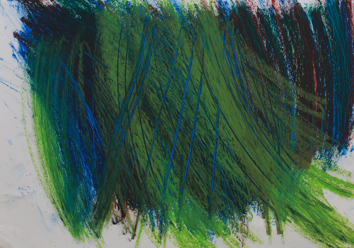 サウスポーでクレヨンを持ち、縦横無尽にクレヨンを走らせ、色を深く塗り重ねていく。