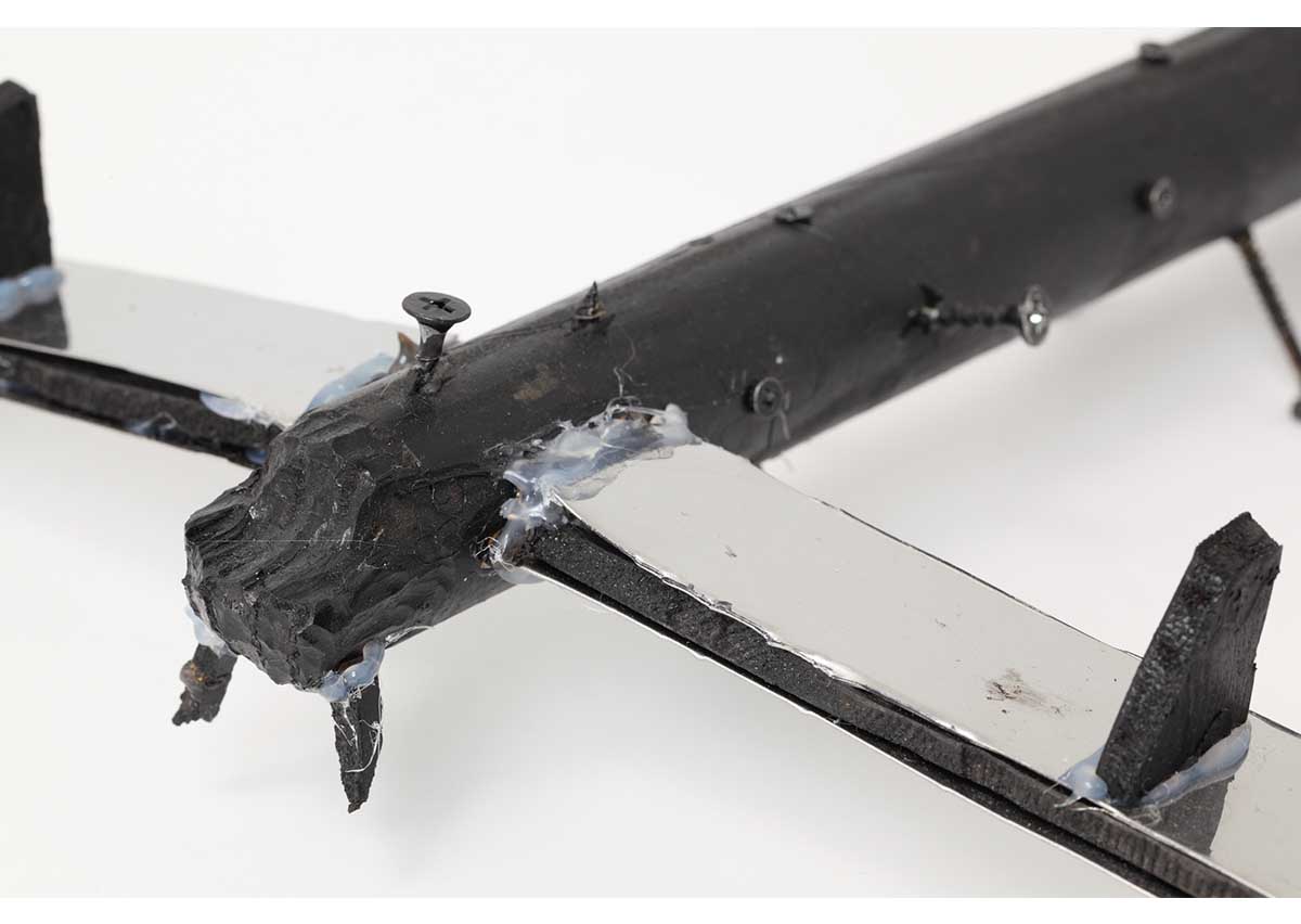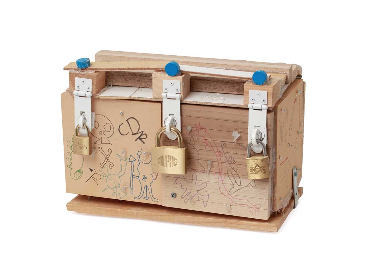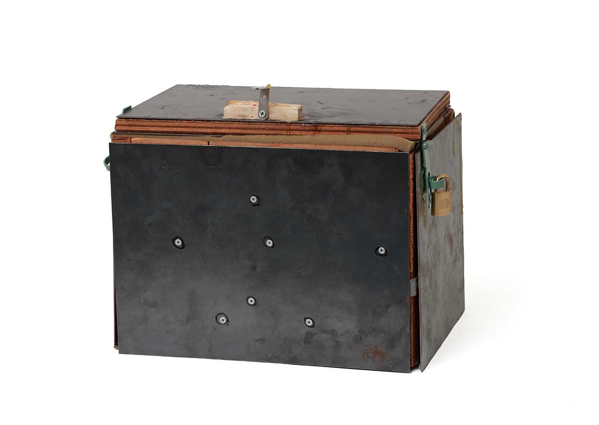 鉄板や釘、髑髏マークというような毒々しいボックス(木の箱)の作品。
