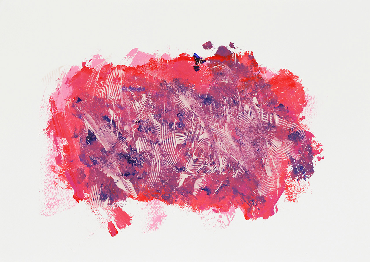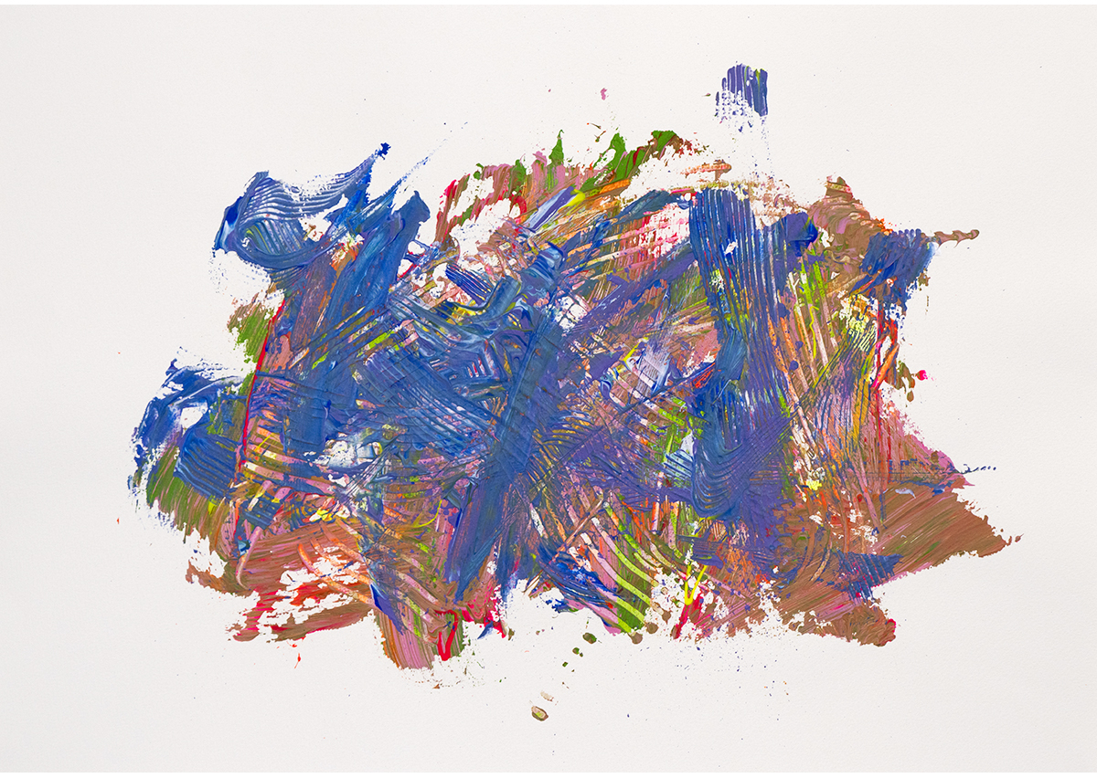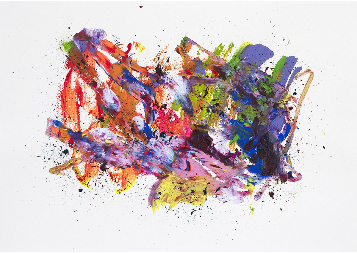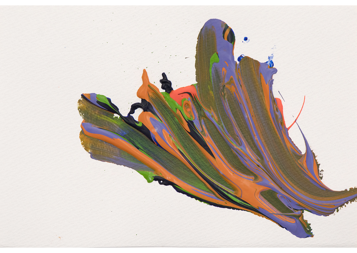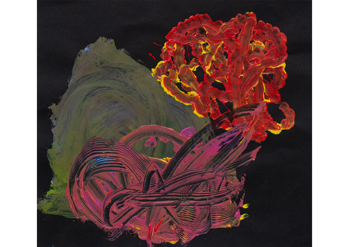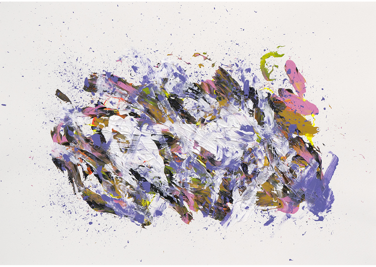 そんな真緒さんの絵画はとてもダイナミック。画用紙に直接、好きな色の絵具をたっぷりのせて、そこから刷毛やローラーを使い、勢いよく描き始める。ピンクやオレンジの鮮やかな蛍光色が最近のお気に入りで、描画材には掃除ブラシや化粧のチークを使うことも。集中すると1日に5枚描くこともあり、たくさんの色彩豊かな作品を生み出し続けている。
