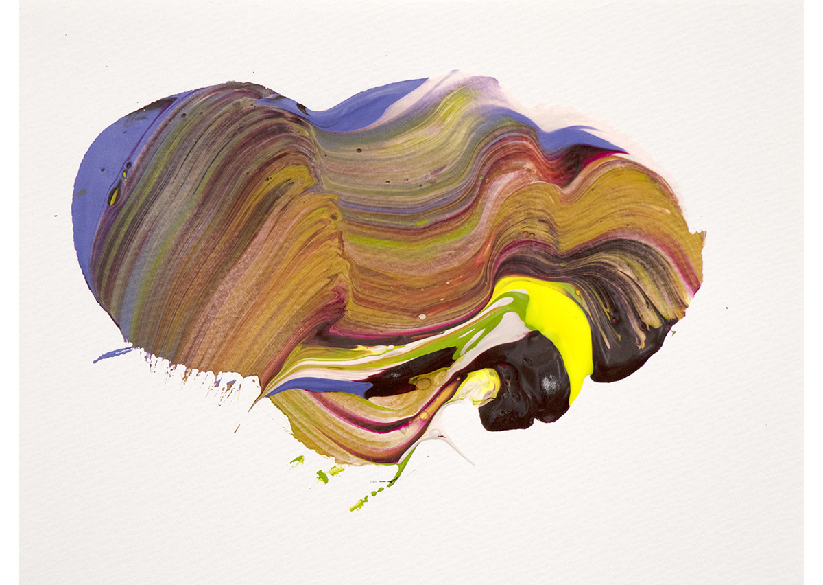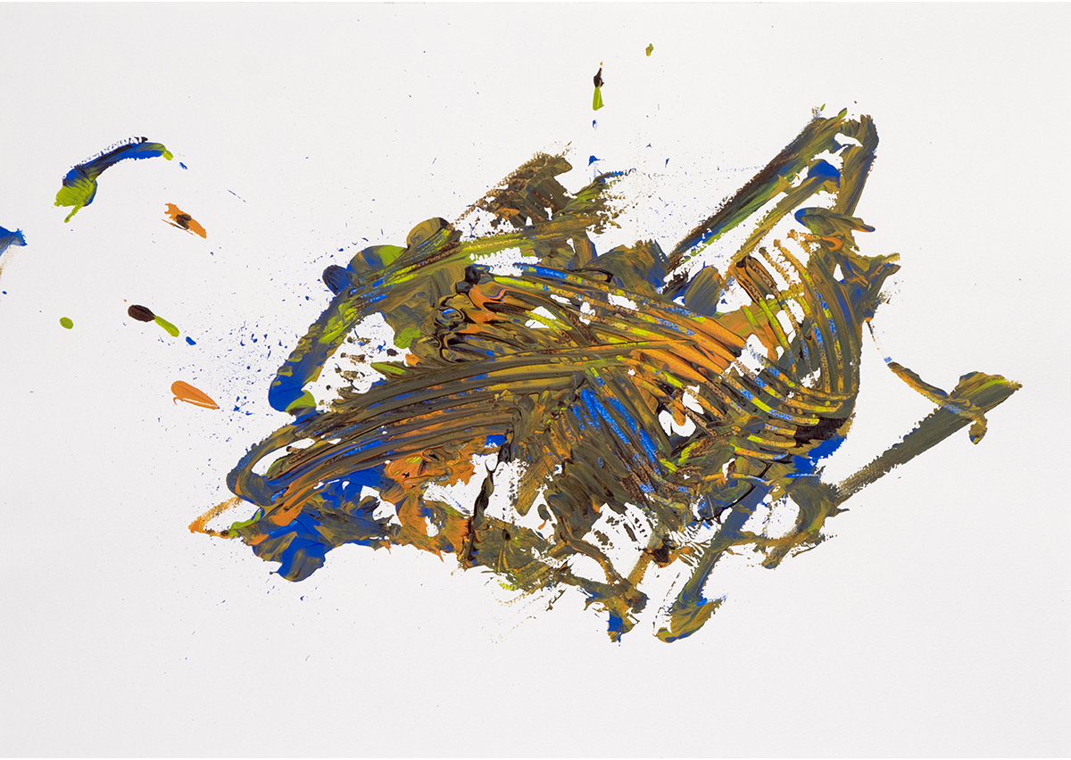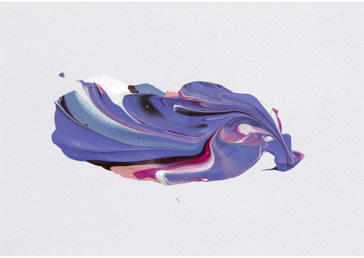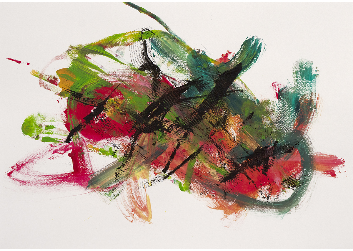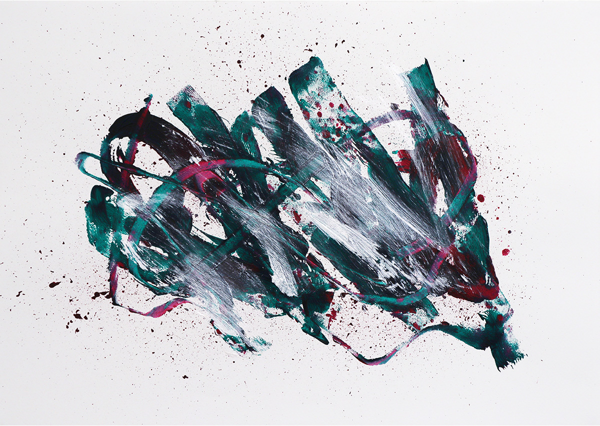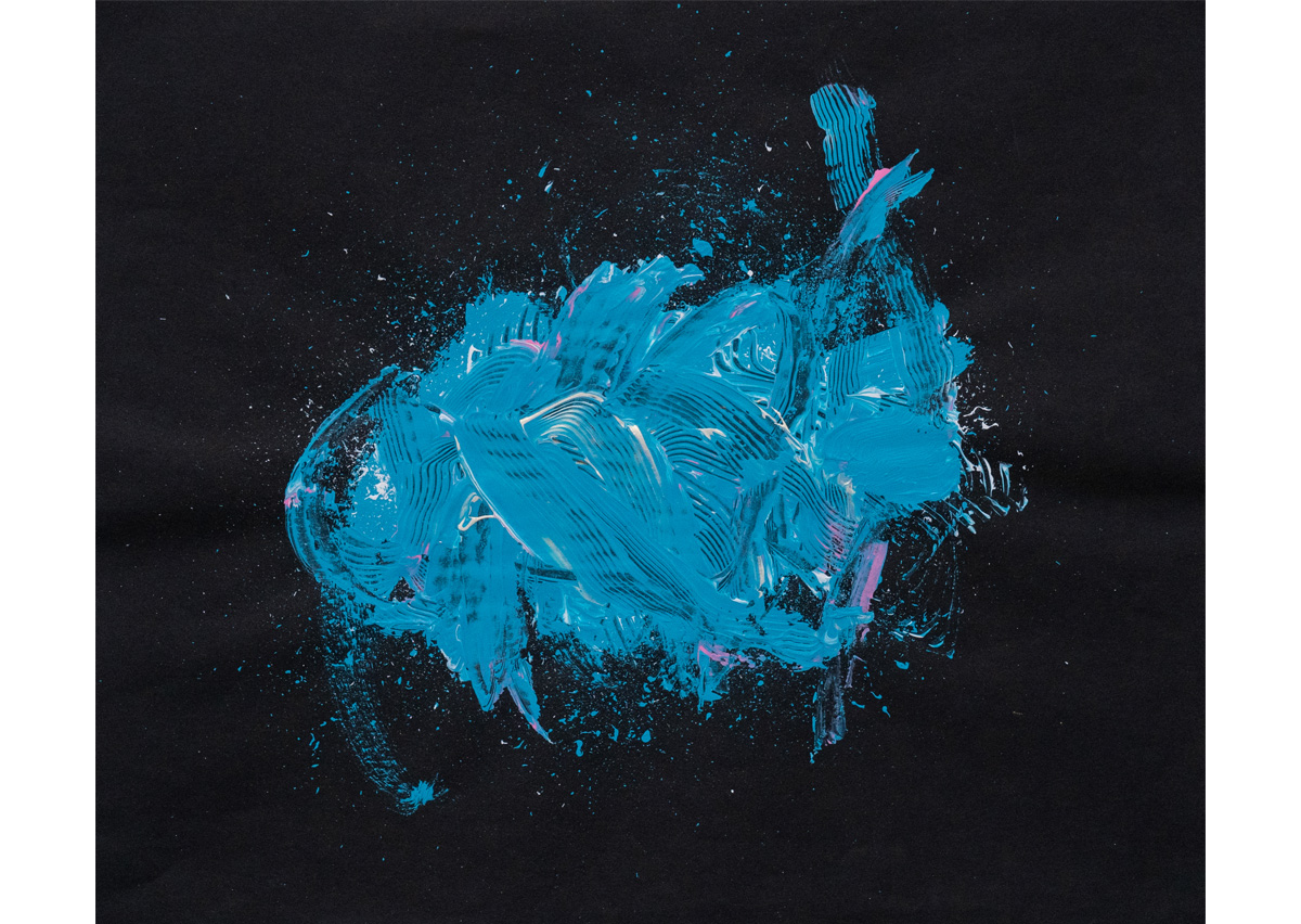 そんな真緒さんの絵画はとてもダイナミック。画用紙に直接、好きな色の絵具をたっぷりのせて、そこから刷毛やローラーを使い、勢いよく描き始める。ピンクやオレンジの鮮やかな蛍光色が最近のお気に入りで、描画材には掃除ブラシや化粧のチークを使うことも。集中すると1日に5枚描くこともあり、たくさんの色彩豊かな作品を生み出し続けている。