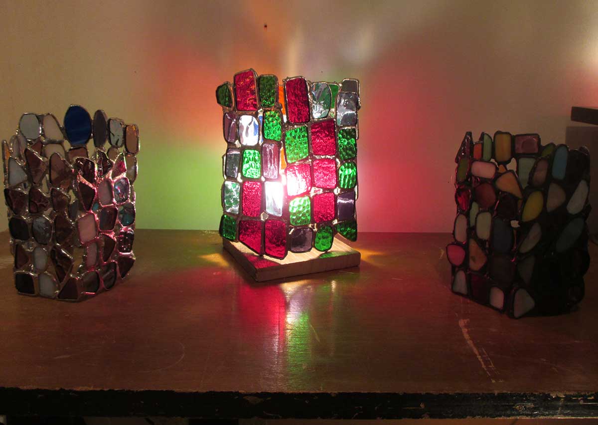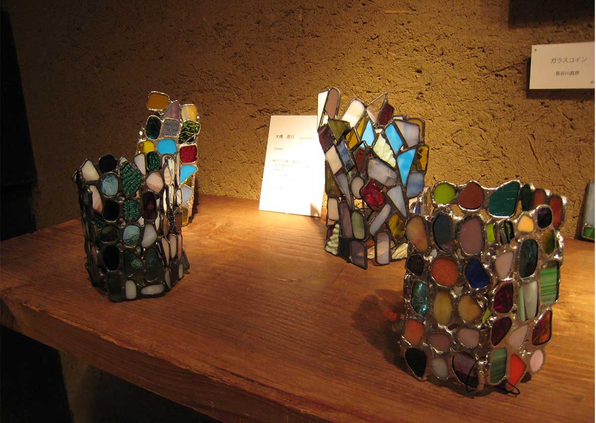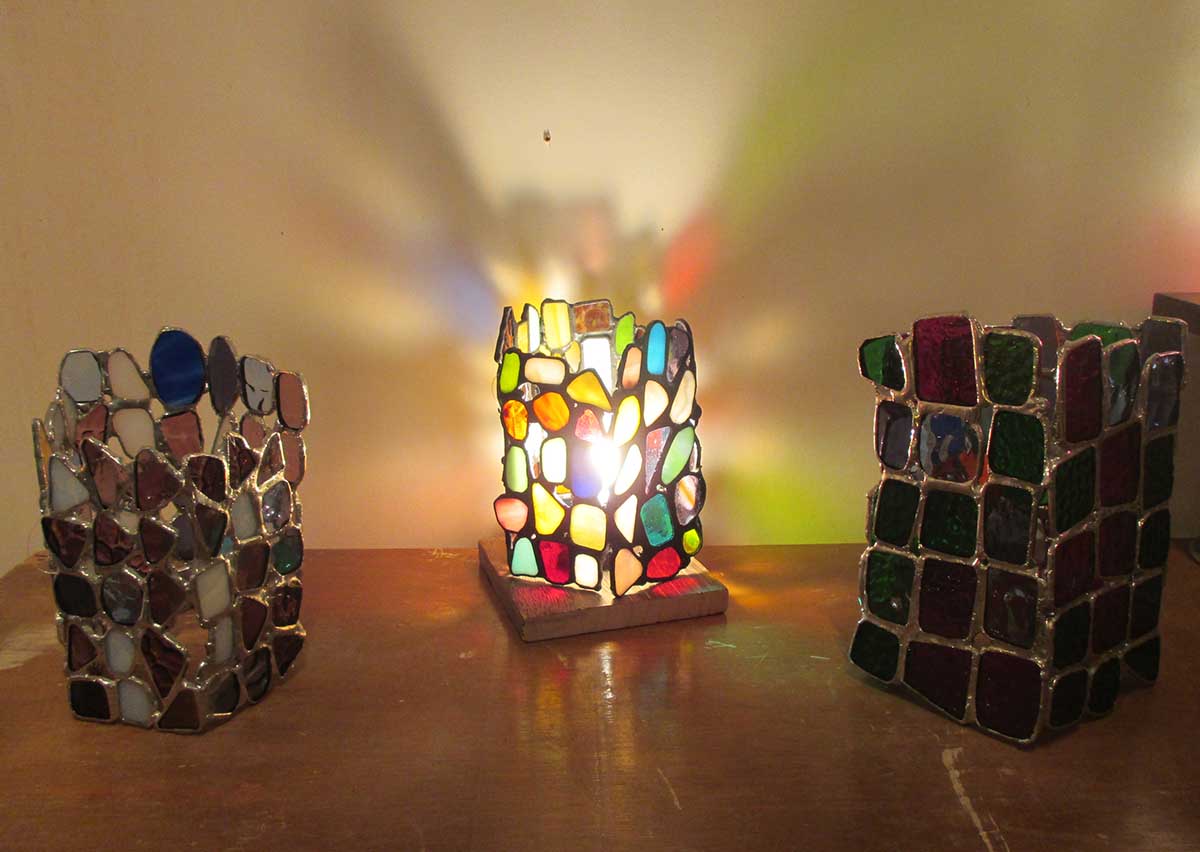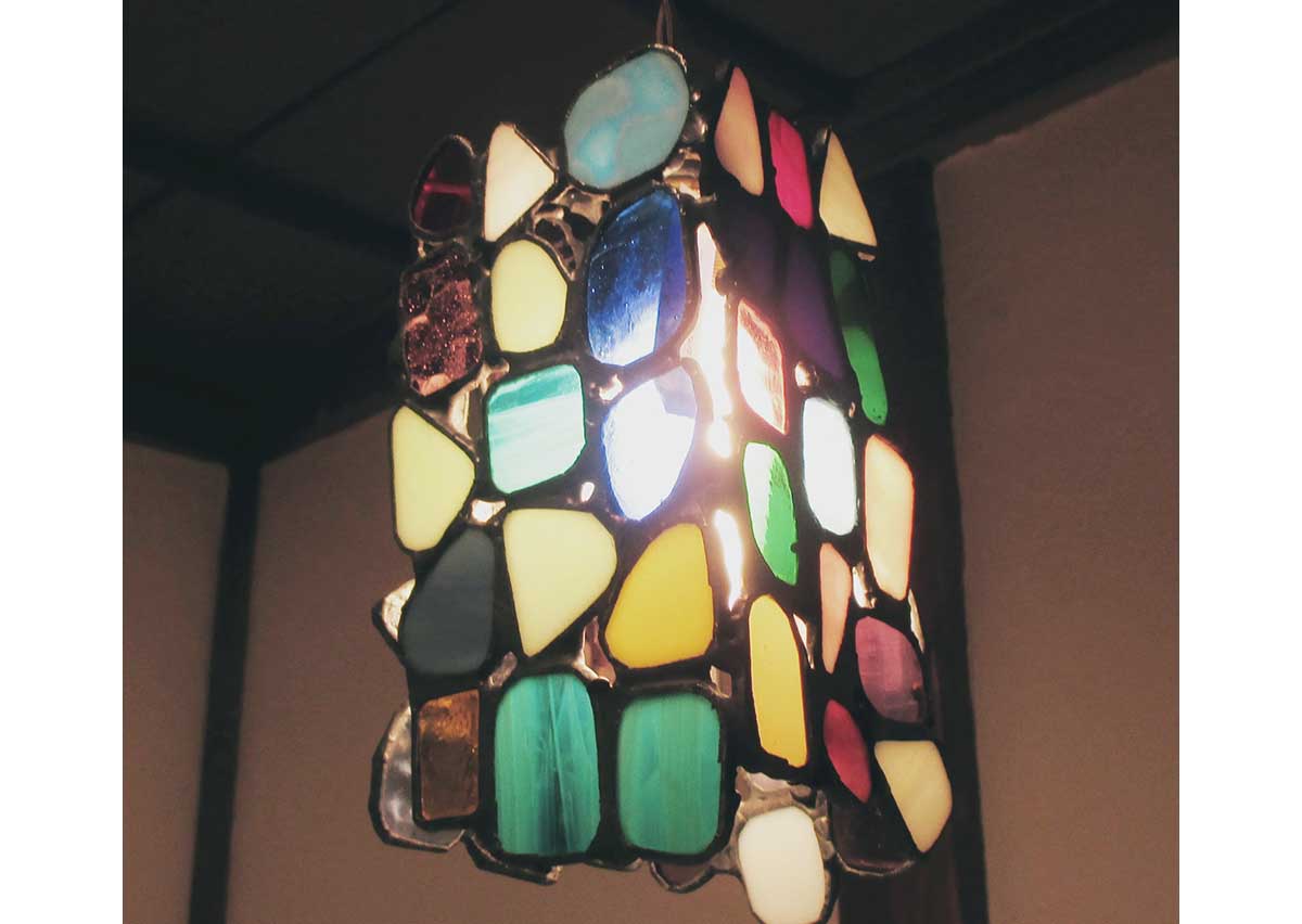 彼がガラスを選び、適当な大きさや形に切ったものを組み合わせていく。 時間をかけてガラスを削るため、いつしかひとつひとつのガラスの形状が楕円で丸みを帯びるようになってきた。 それらを組み合わせて出来上がったランプシェードは、灯りを入れると温かく、不思議な気持ちになってしまう。