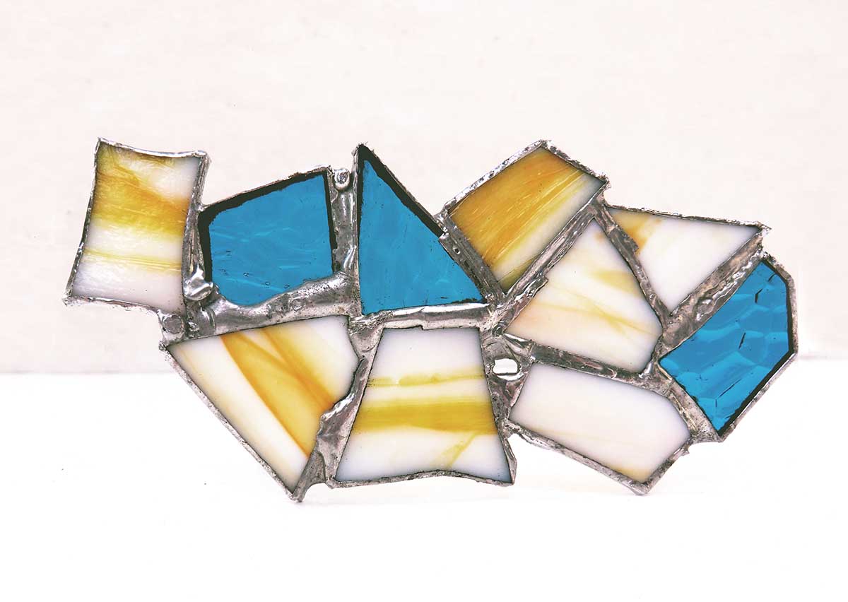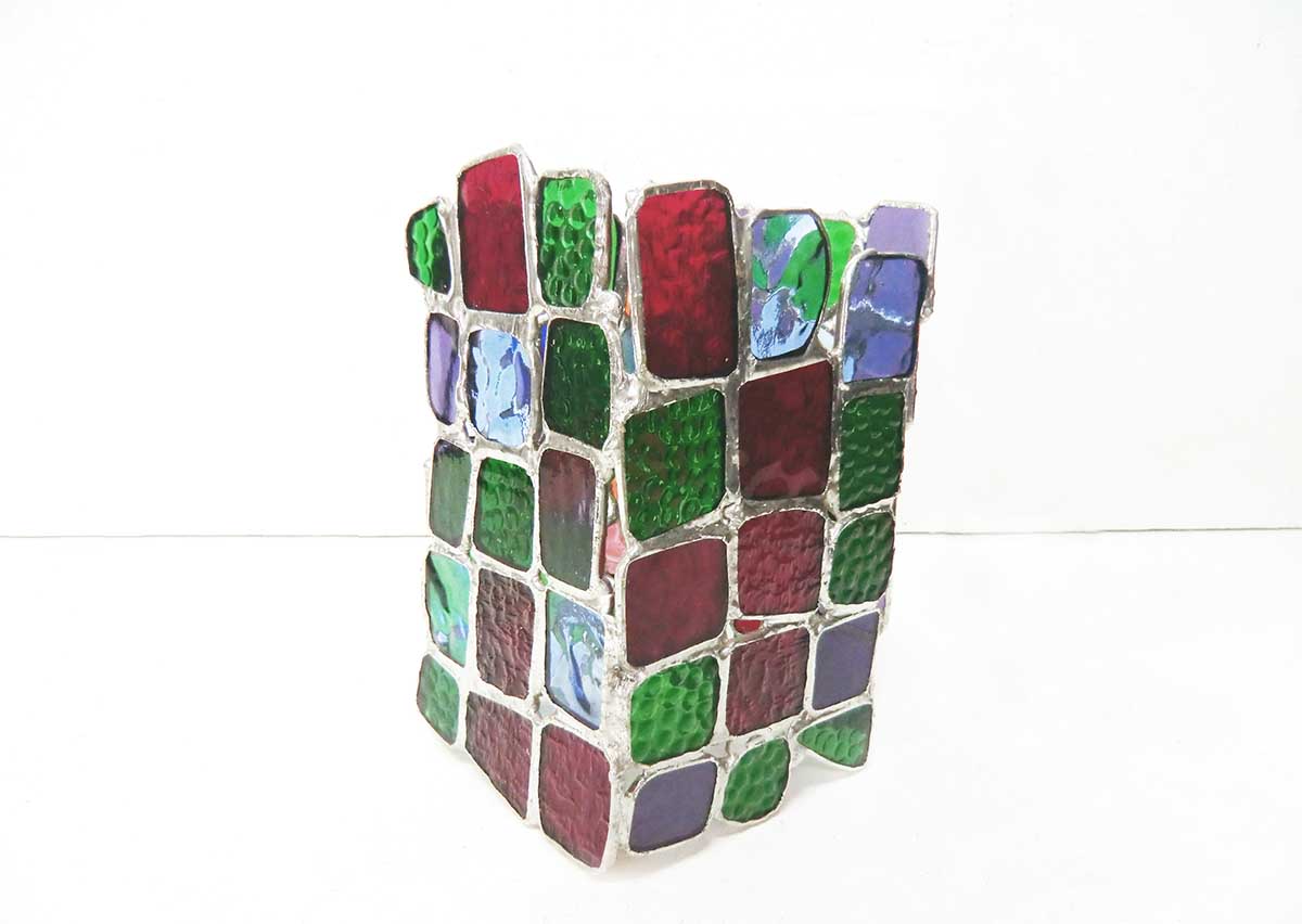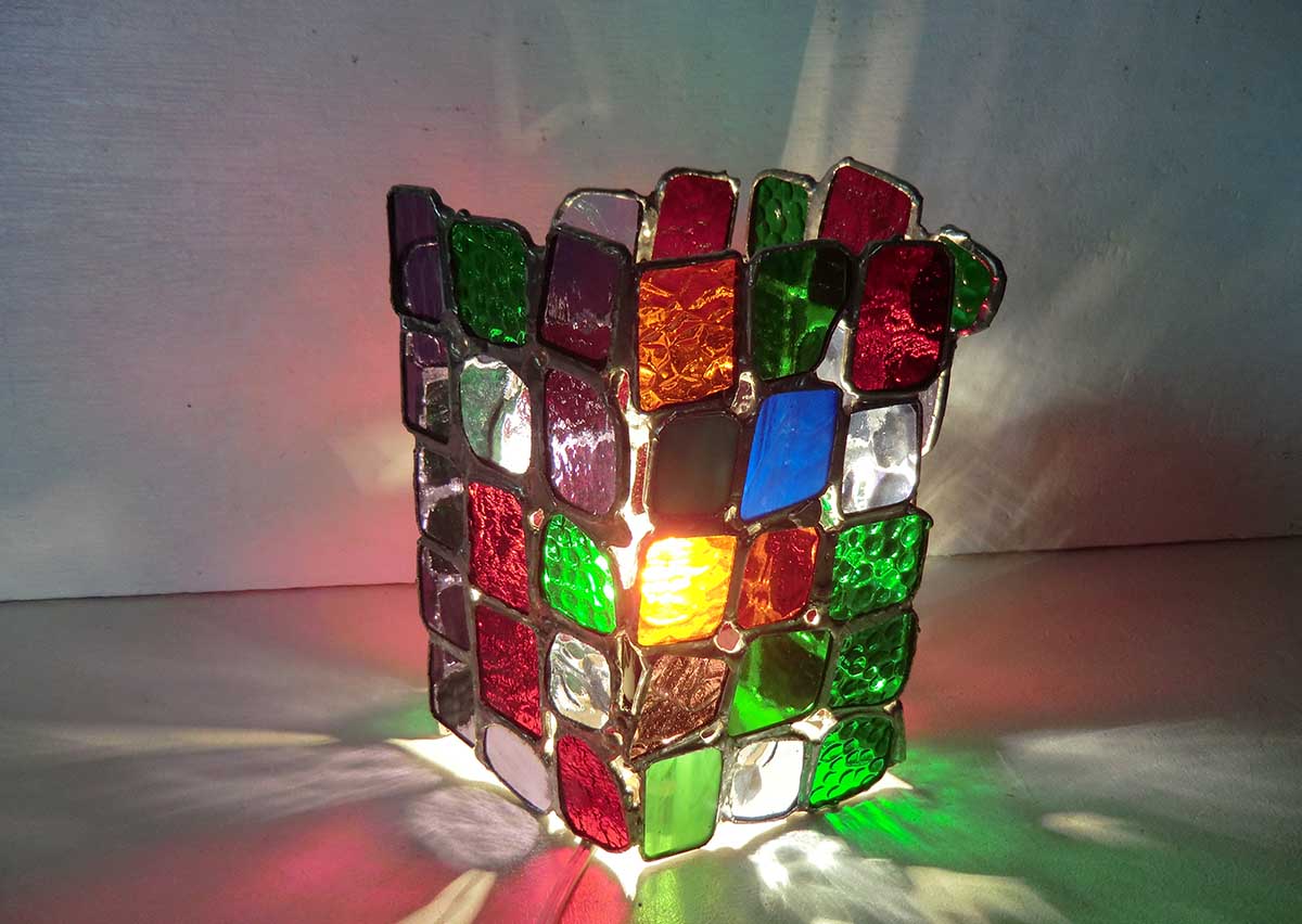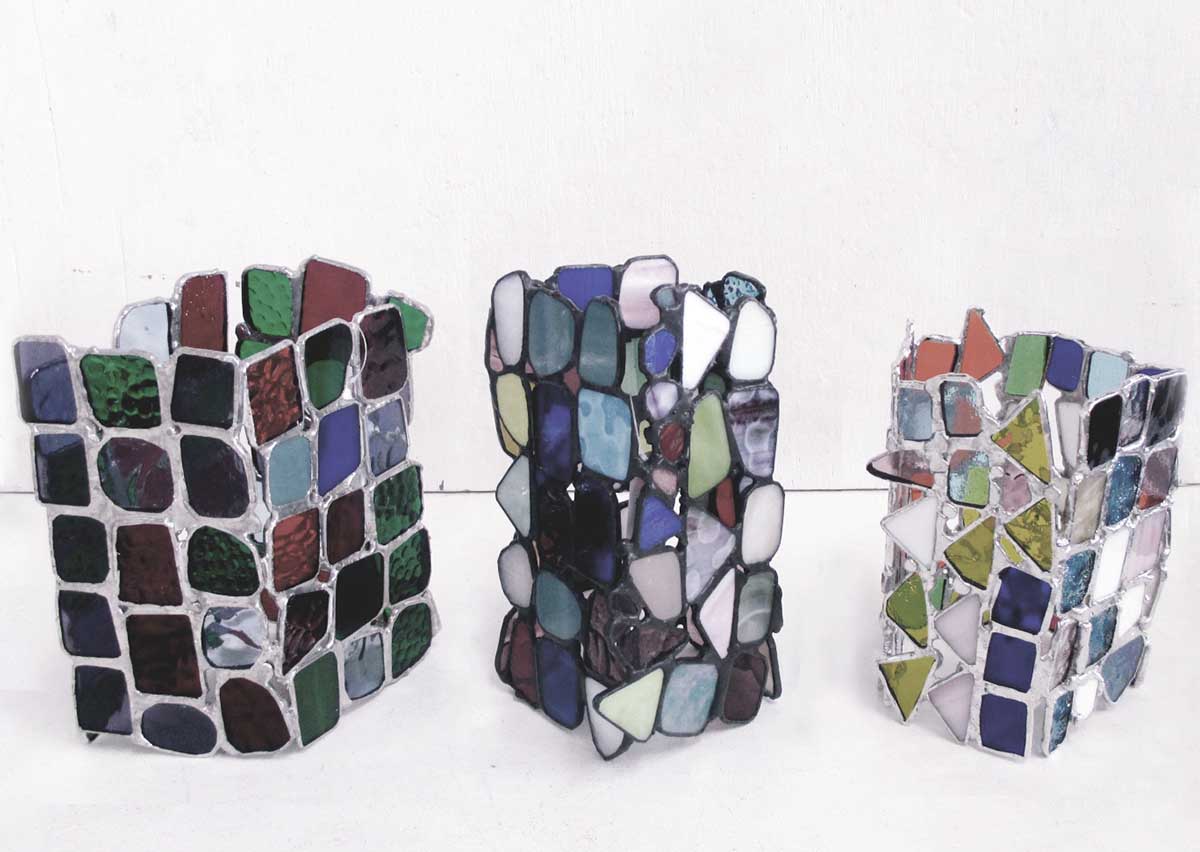 彼がガラスを選び、適当な大きさや形に切ったものを組み合わせていく。 時間をかけてガラスを削るため、いつしかひとつひとつのガラスの形状が楕円で丸みを帯びるようになってきた。 それらを組み合わせて出来上がったランプシェードは、灯りを入れると温かく、不思議な気持ちになってしまう。