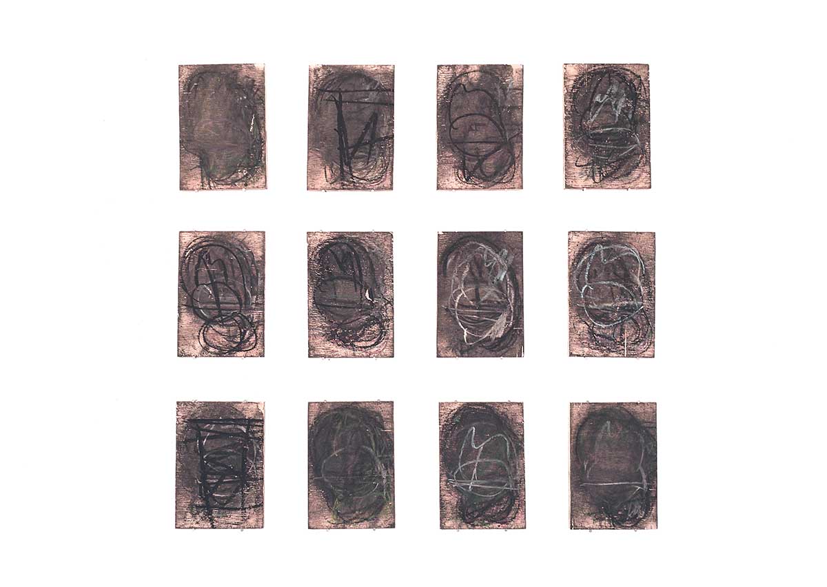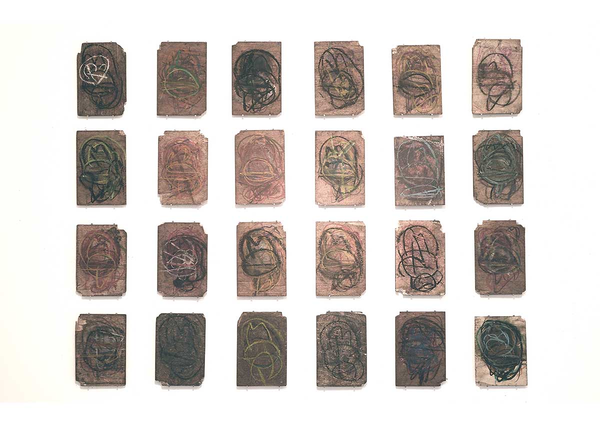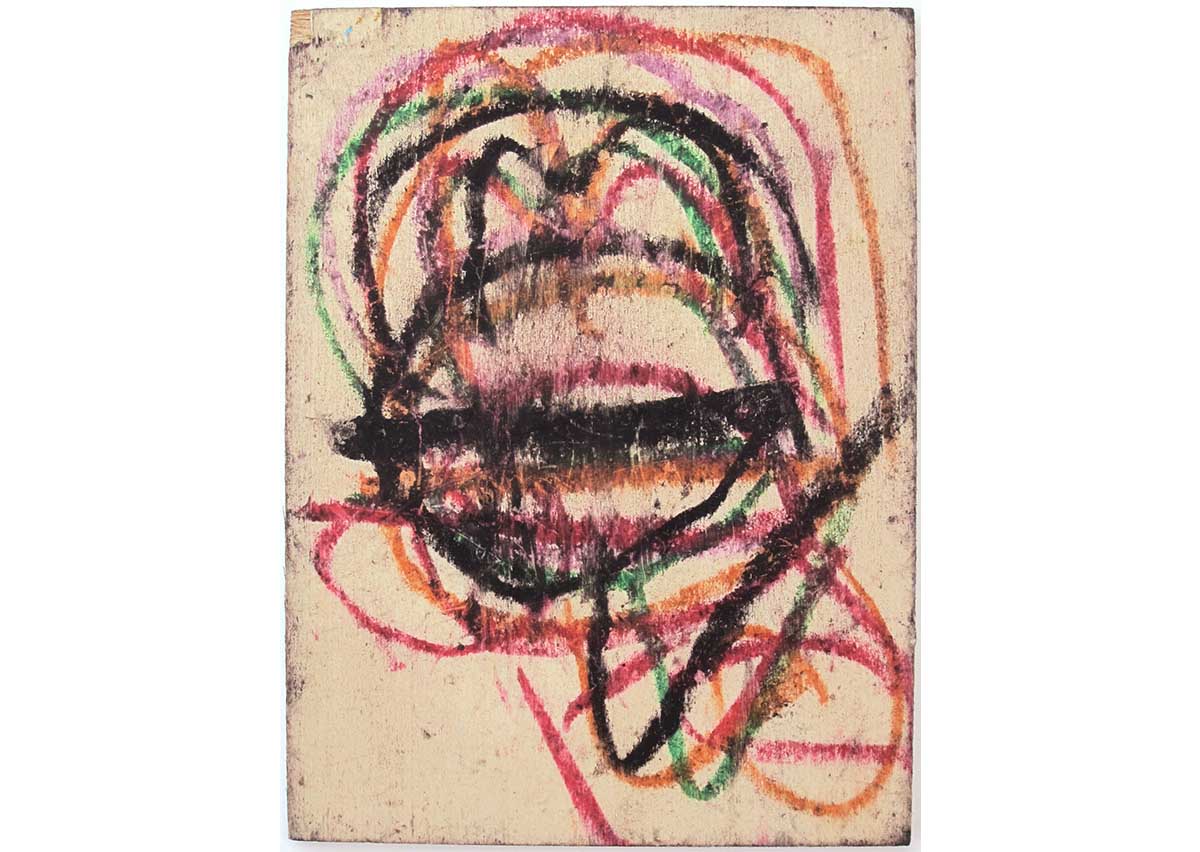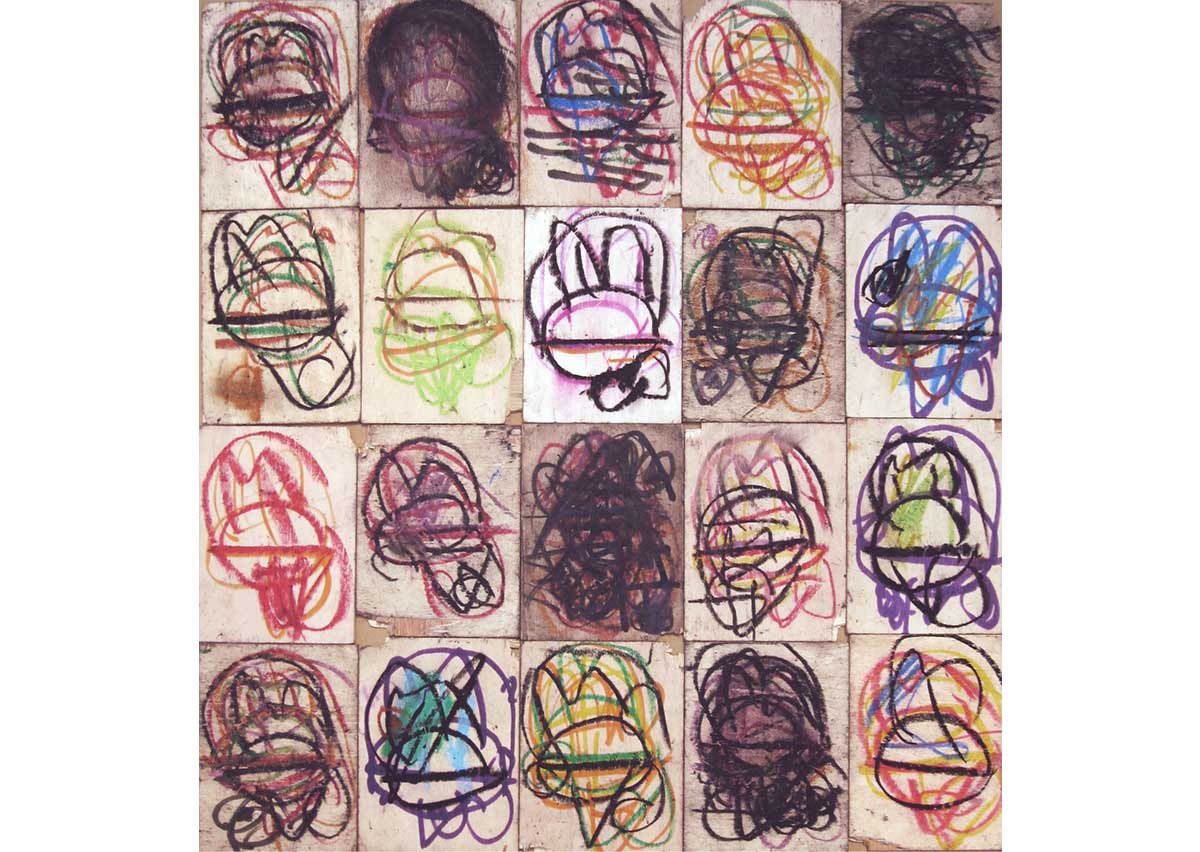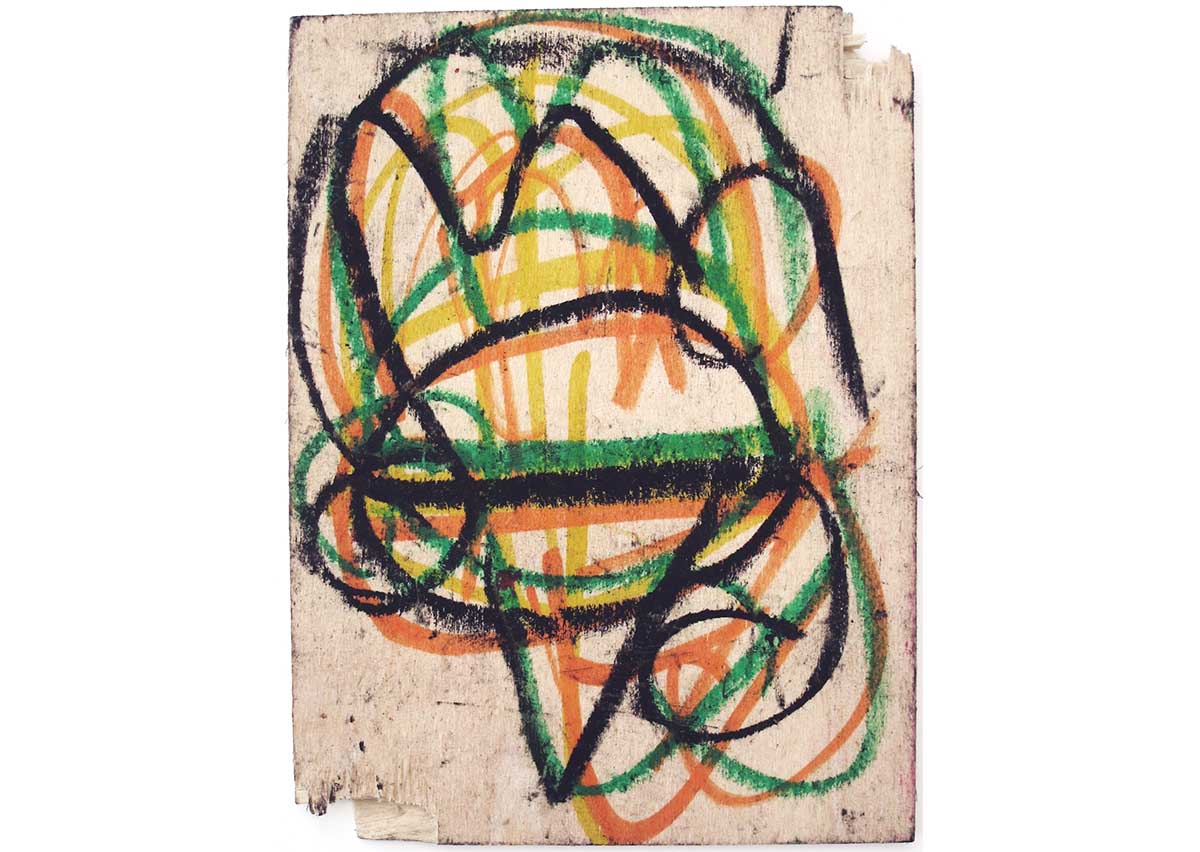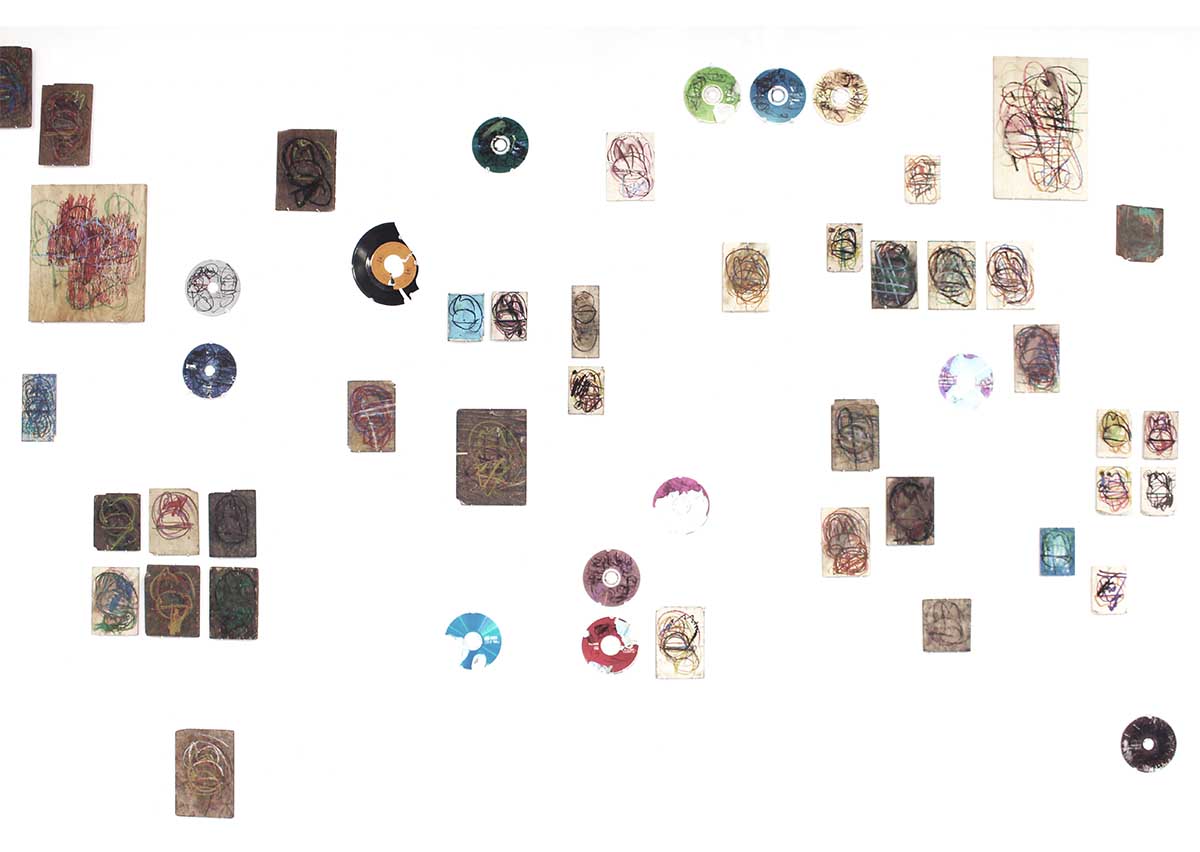 レコード盤からCDへ、そして段ボールの切れ端からベニヤ板(本人曰く「しかく」)へと変遷してきた画材。