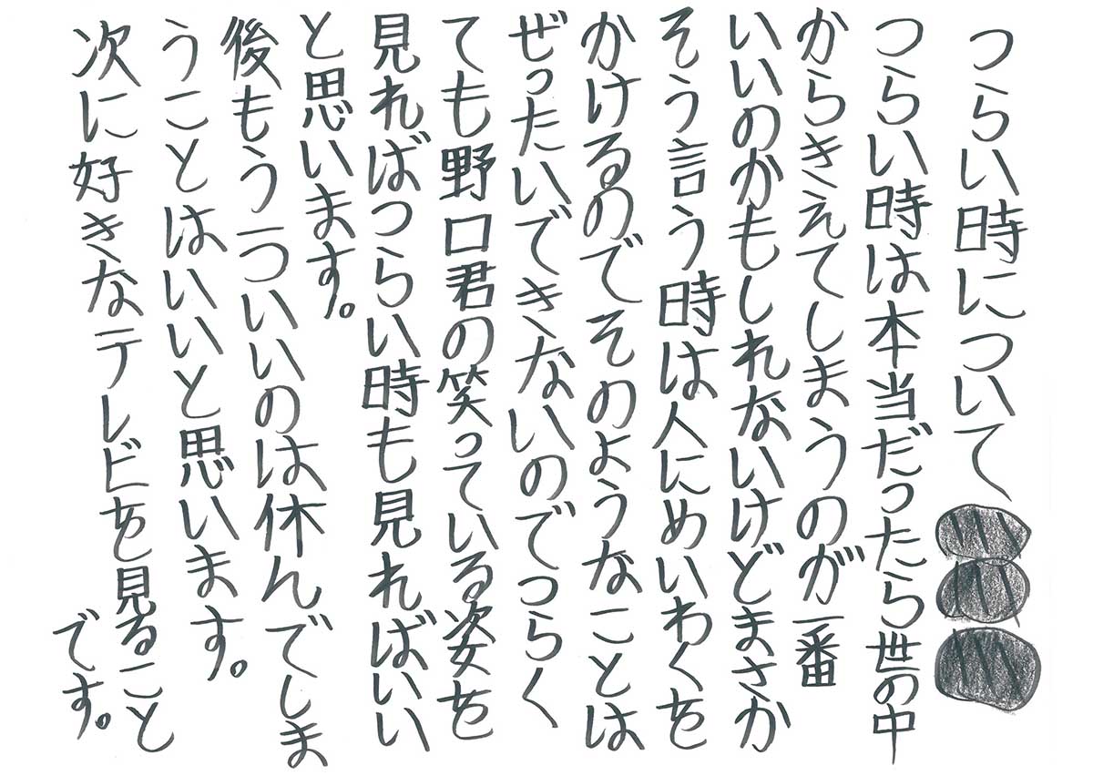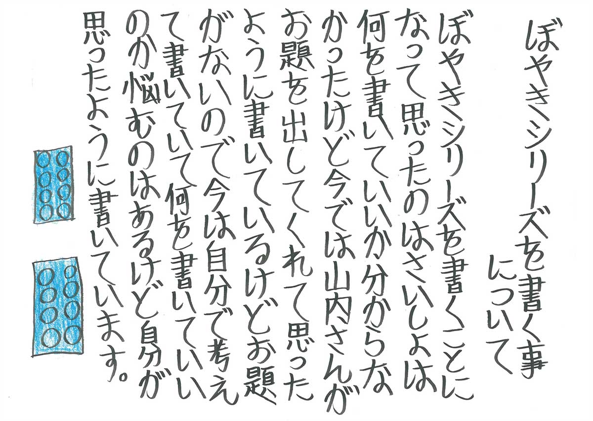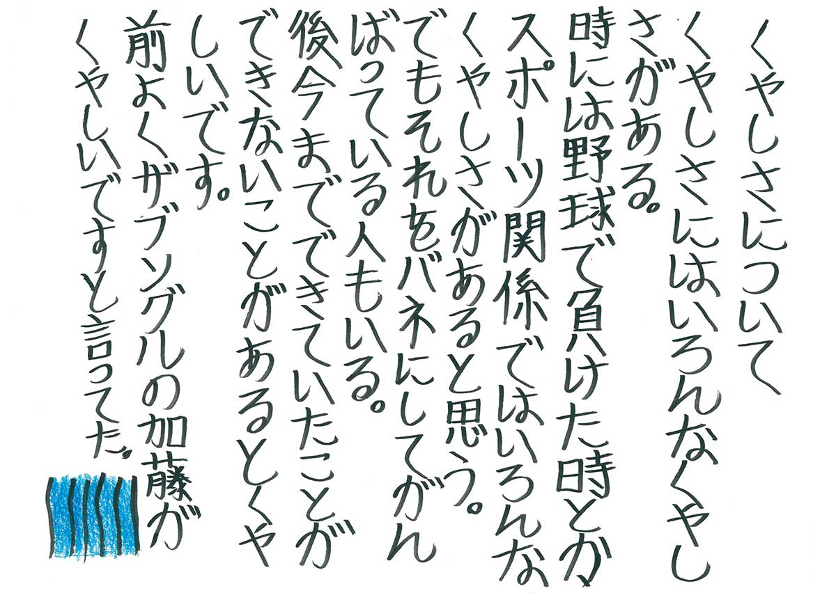 これまで知らなかった彼を垣間見ることが出来た。周りの仲間をよく見ている。色々なことを感じて、いっぱい胸にしまっている。