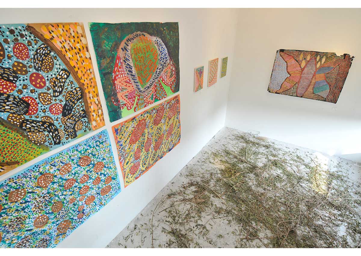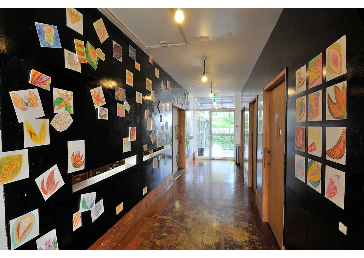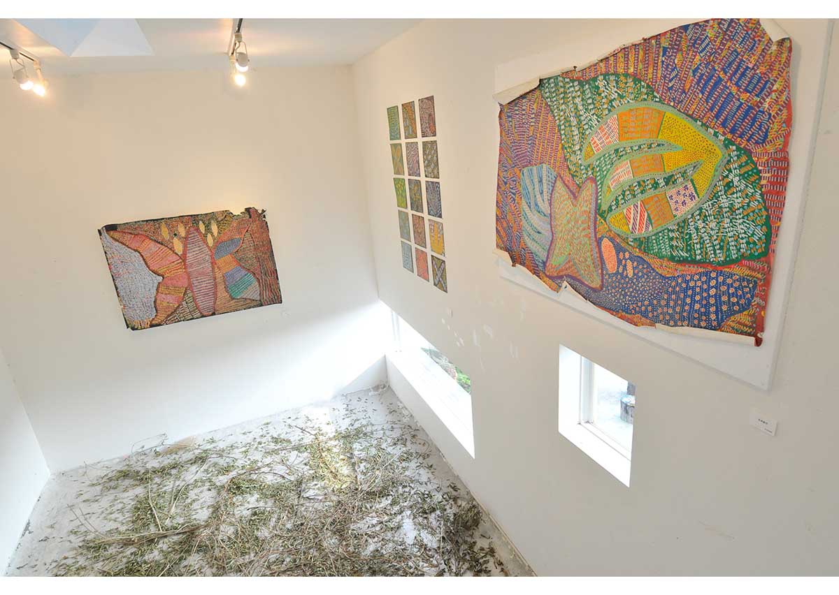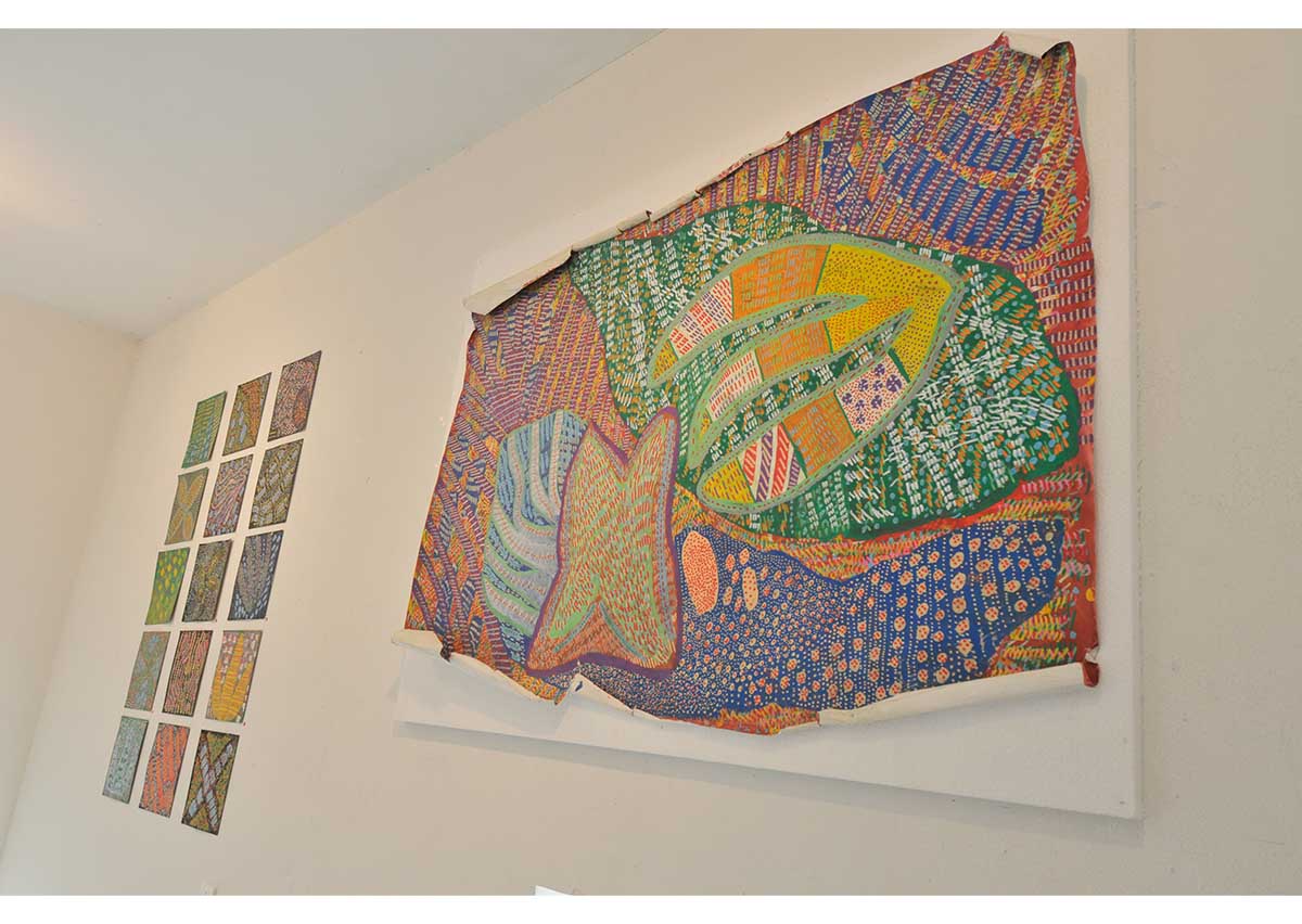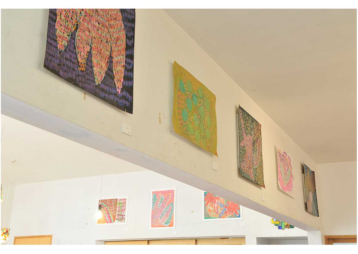 アクリル、グアッシュ、マーカーやオイルパステルなどで描かれた絵画やドローイングが50点近く工房集のギャラリ-、ダイニング、エントランス、廊下に展示されました。