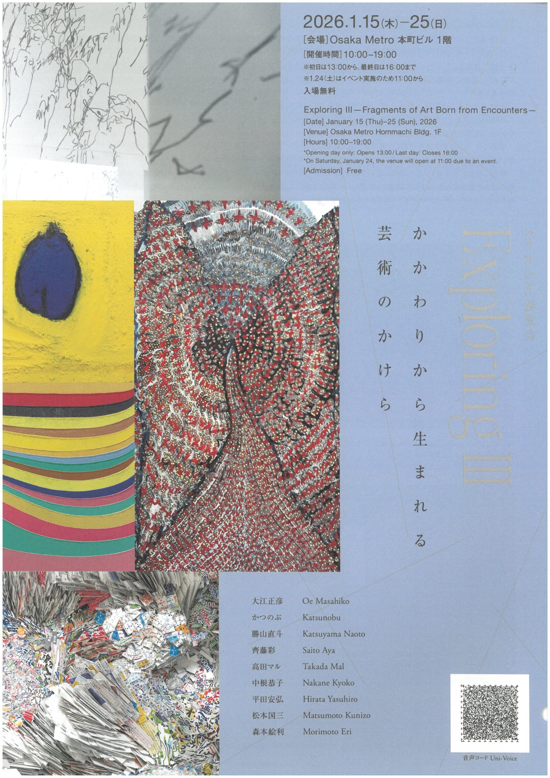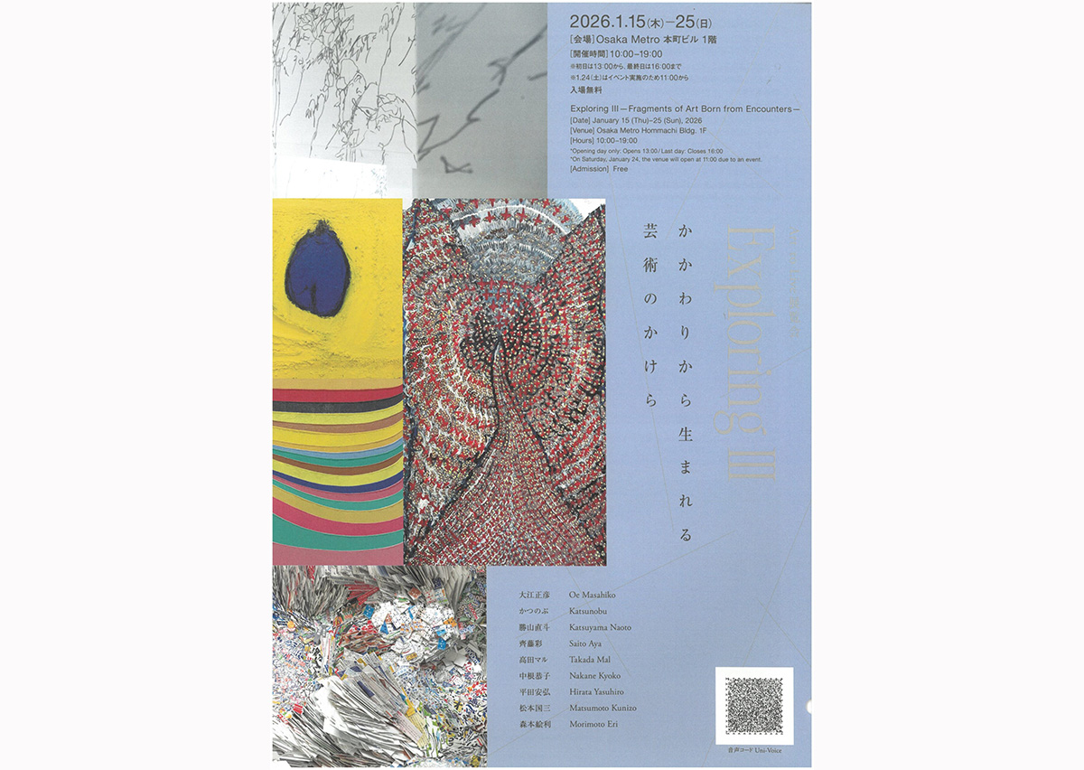 「Exploring Ⅲ – かかわりから生まれる芸術のかけら -」 開催日時 :2026年1月15日(木)ー25日(日) 10:00ー19:00(初日は13:00から、最終日は16:00まで、 1/24(土) はイベント実施のため11:00から) 会場:Osaka Metro 本町ビル 1階(大阪市中央区本町3-6-4) 入場無料 主催:大阪府 工房集出展作家:勝山直斗