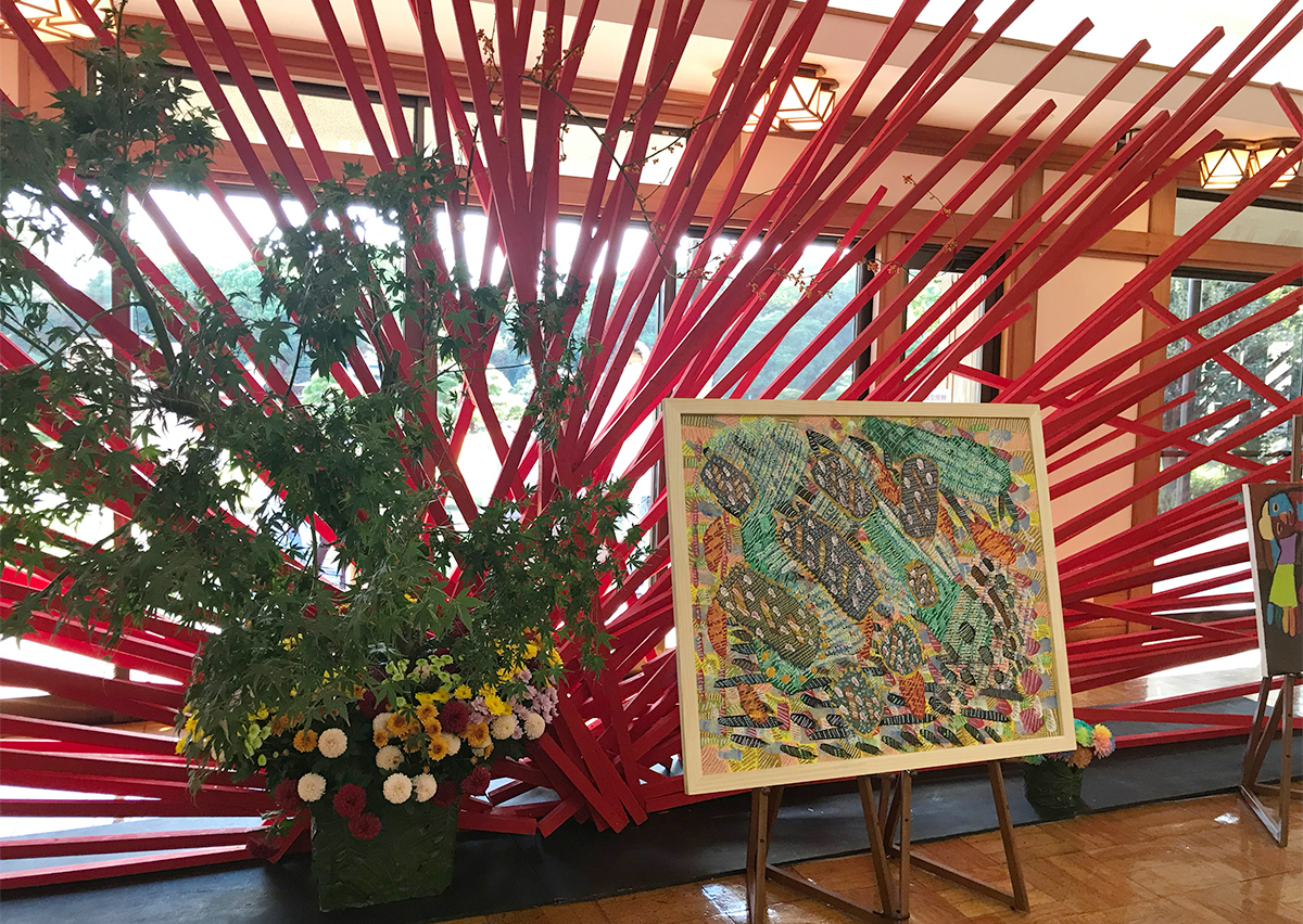華道家の假屋崎省吾さんと庭園を背景に前回公募展上位作品のコラボレーション展示が開催され、
