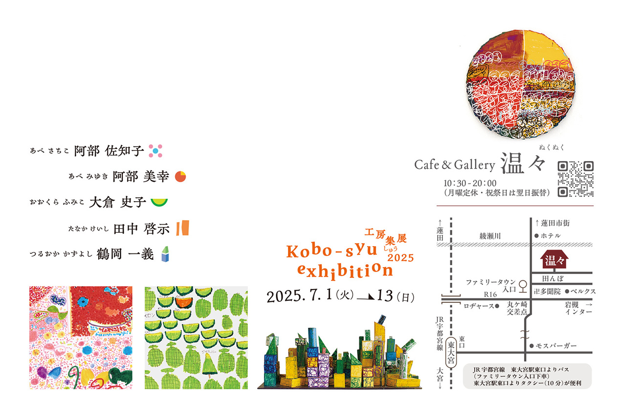 工房集展2025 会期:2025年7月1日(火)-13日(日) 10:30-20:00(月曜定休・祝祭日は振替) 会場:Cafe&Gallery温々[ぬくぬく] 住所:さいたま市見沼区丸ケ崎1856 HP:https://cafe-nukunuku.com/ 出展作家:阿部佐知子、阿部美幸、大倉史子、田中啓示、鶴岡一義