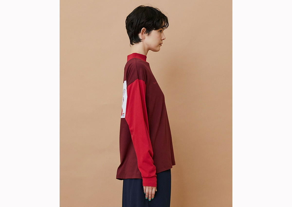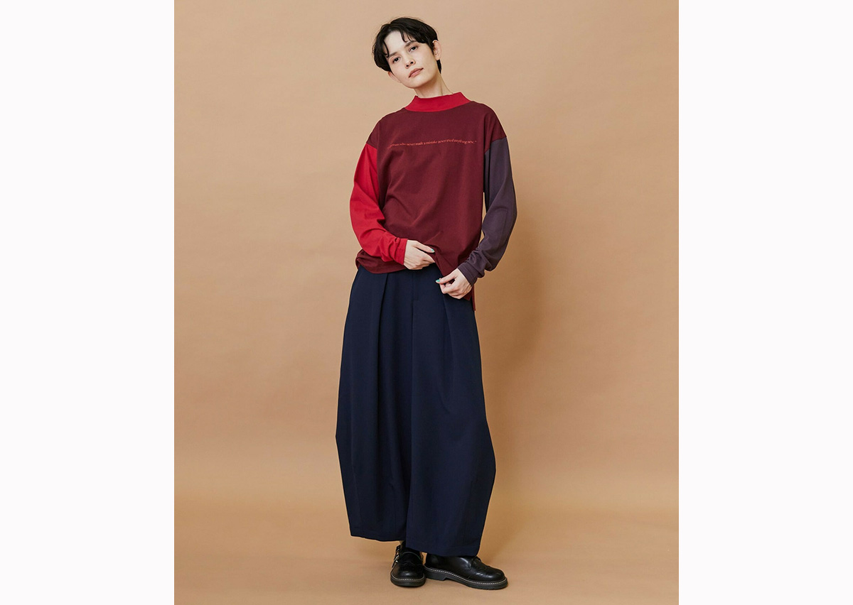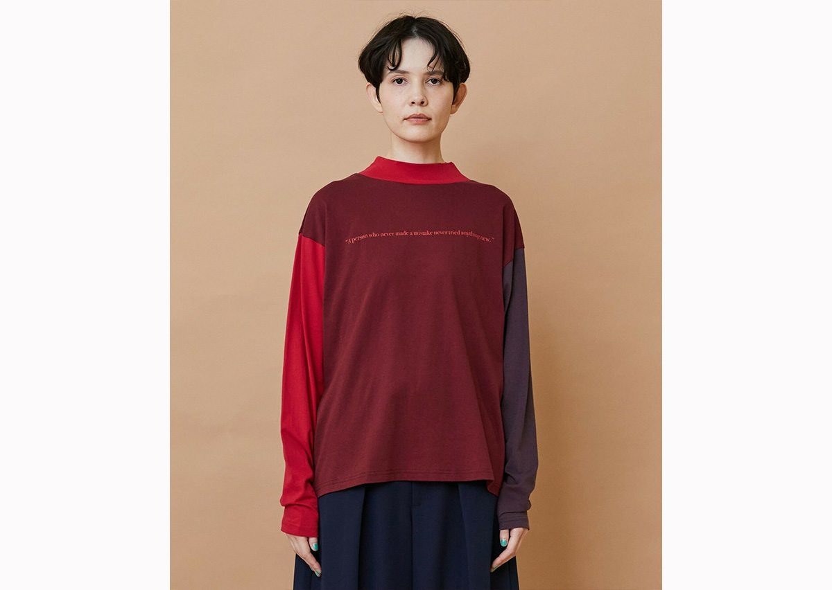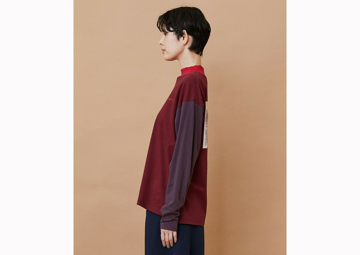 ゆったりとした身頃にハイネックの衿がついたリラックススタイルのカットソーは両袖と身頃が違った色で構成されています。
