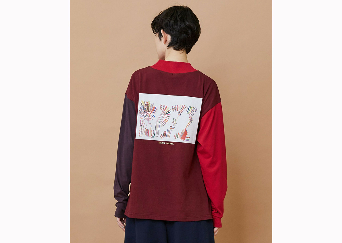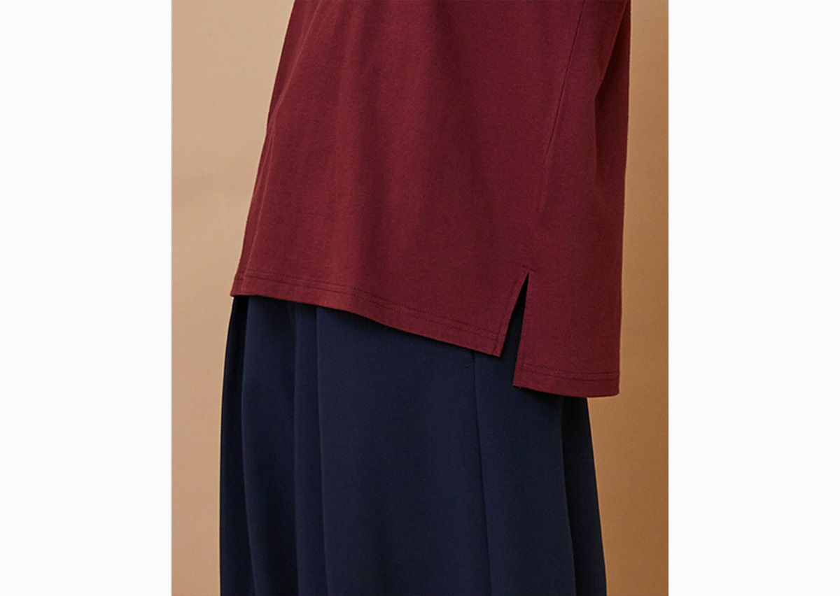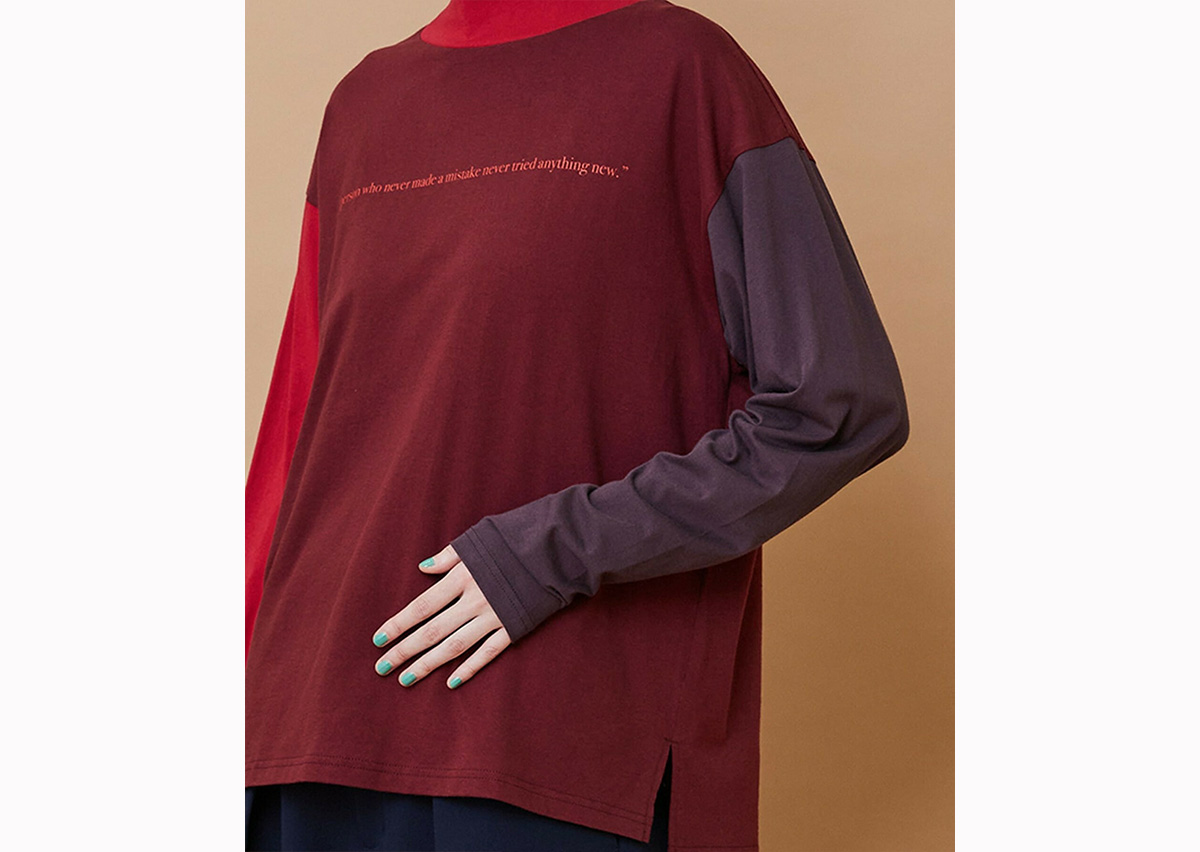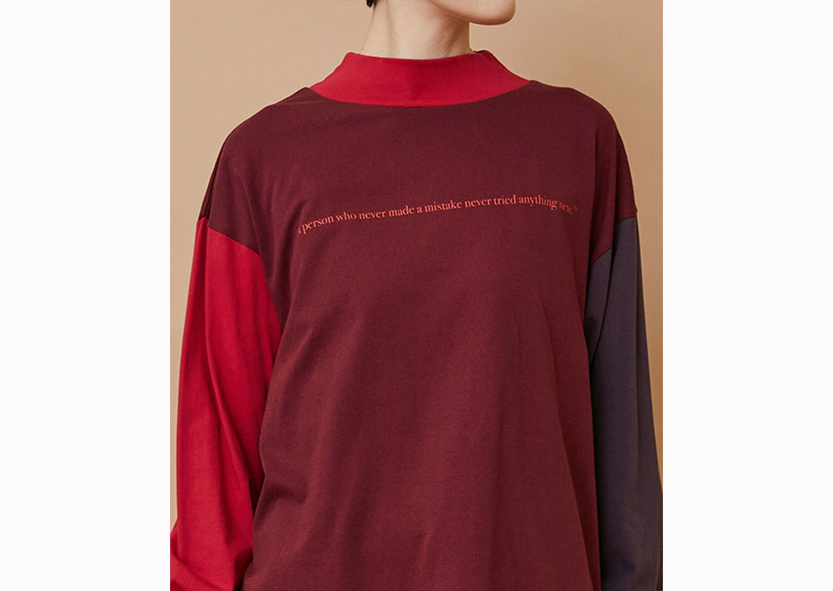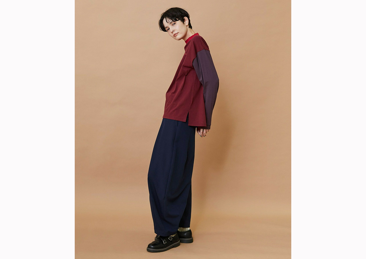 ゆったりとした身頃にハイネックの衿がついたリラックススタイルのカットソーは両袖と身頃が違った色で構成されています。