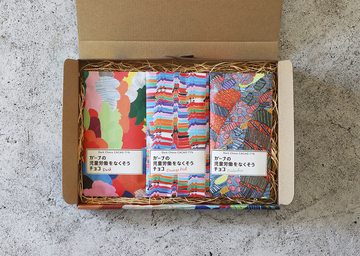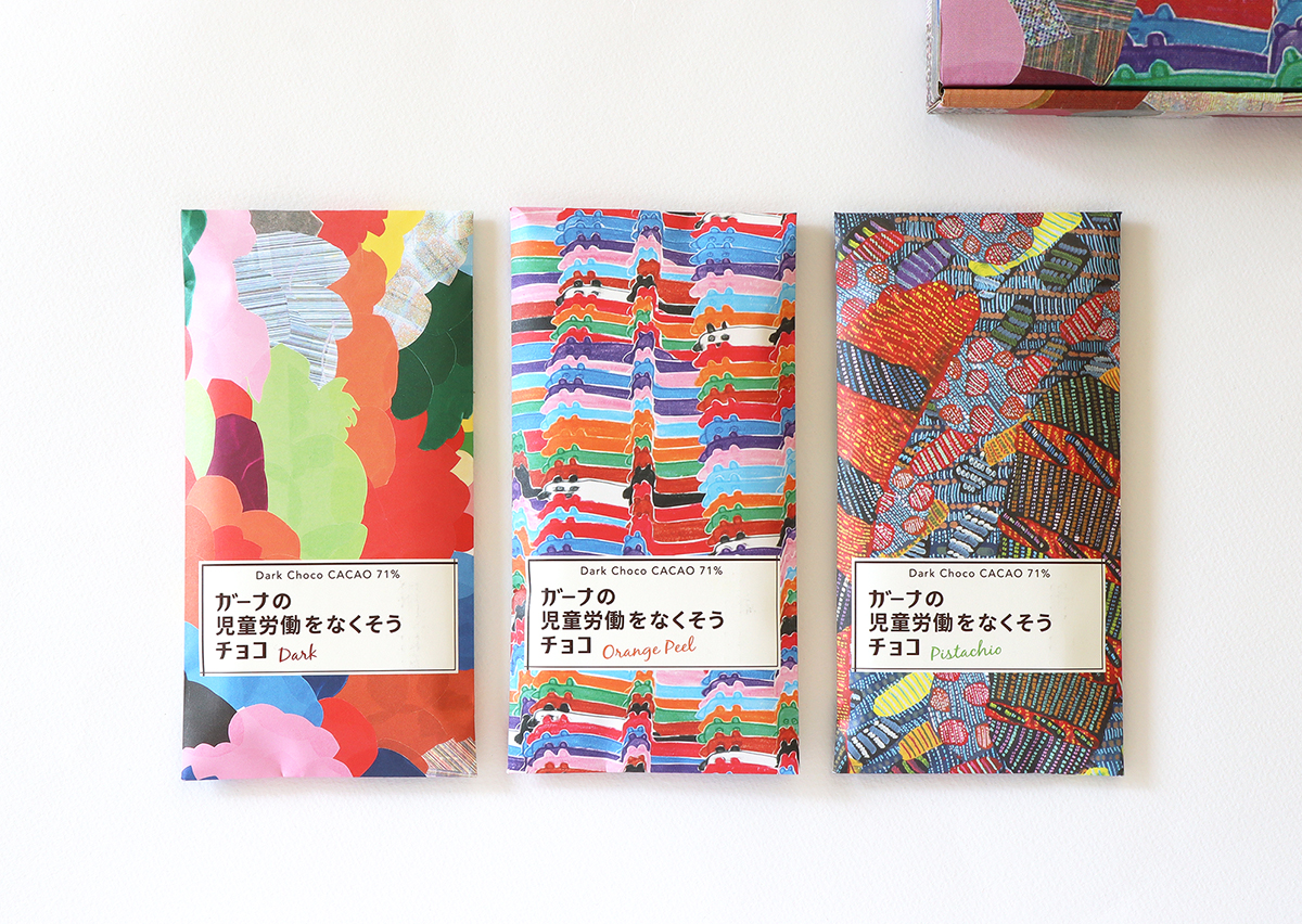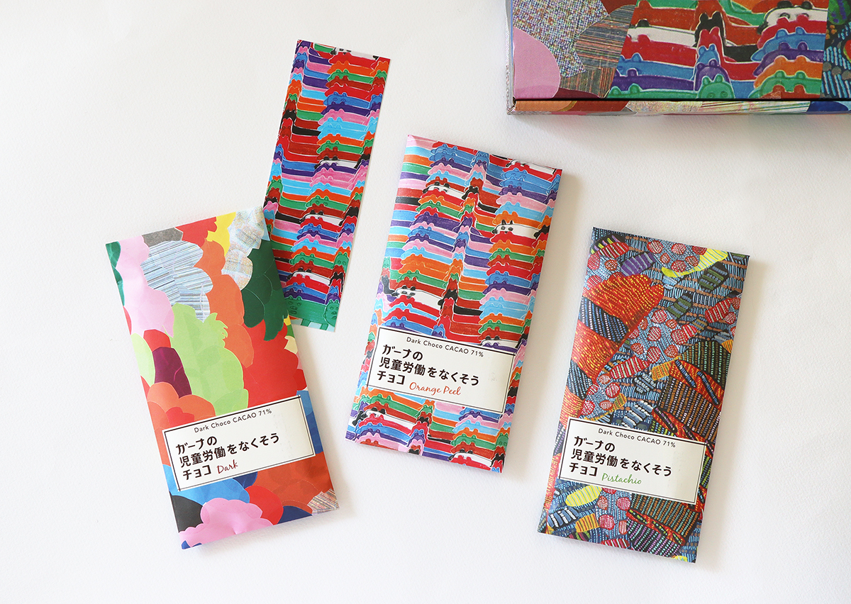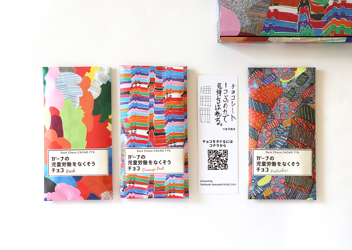株式会社UPDATERさんによるチョコレートのパッケージに高谷こずえさん、山﨑利之さん、西川泰弘さんの作品が使用されました。
