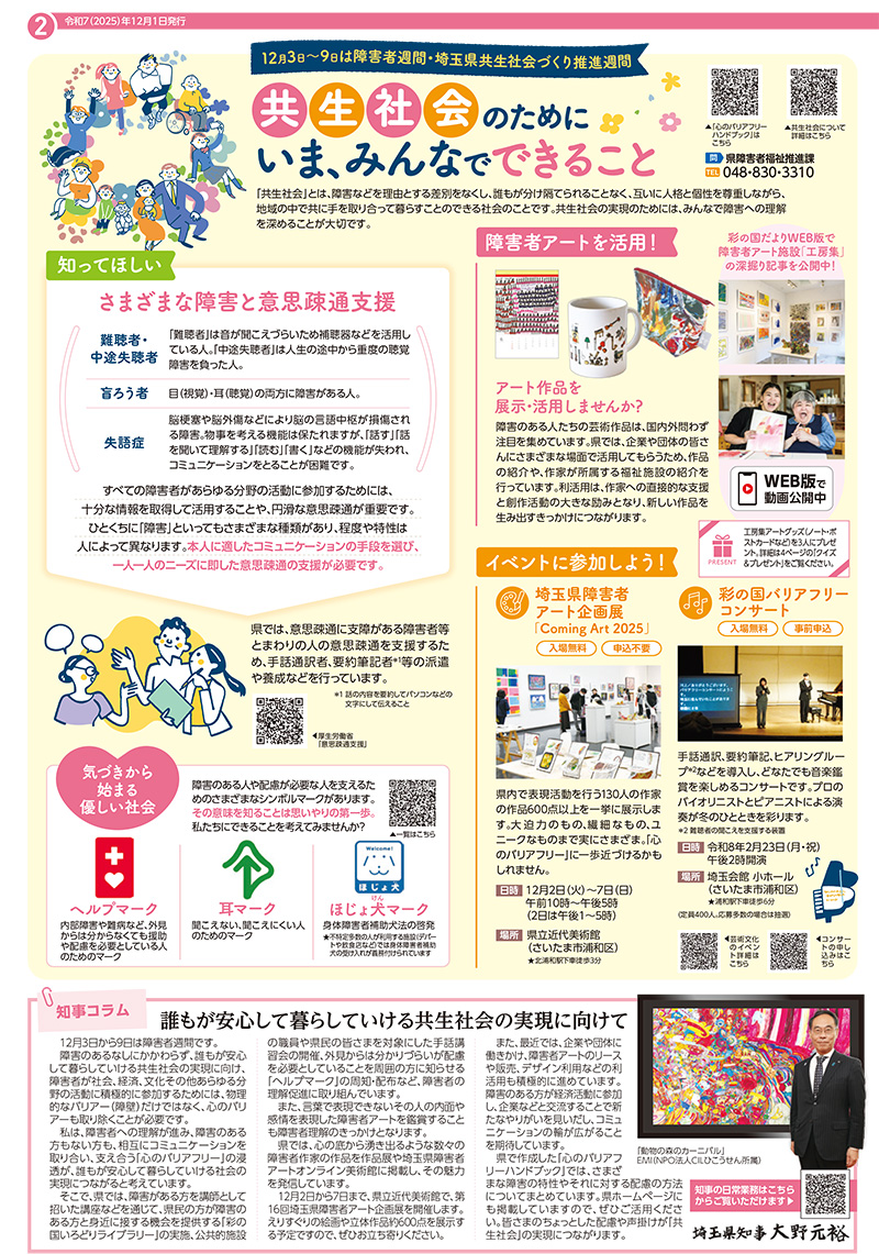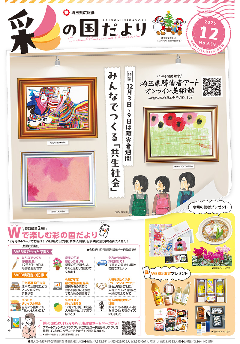 埼玉県広報誌「彩の国だより」令和7年12月号に掲載されました。 また、12月3日~9日は障害者週間・埼玉県共生社会づくり推進週間として工房集が特集され、仲間たちの創作現場に密着して記事にしていただきました。